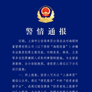 9月11日,上海市公安局奉贤分局发布通报称,近期,上海市公安局奉贤分局依法对海银财富管理有限公司涉嫌非法集资犯罪立案侦查,对韩某某、韩某、王某等多名犯罪嫌疑人采取刑事强制措施。目前公安机关正全面搜集犯罪证据,全力推进案件侦办、追赃挽损等各项工作,最大限度保护投资人权益。