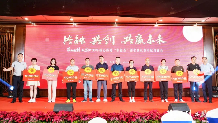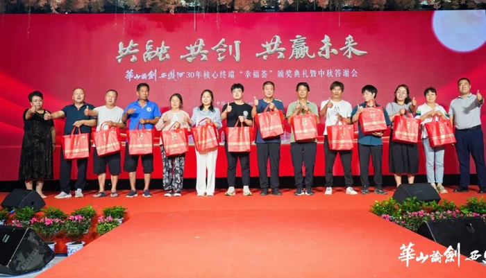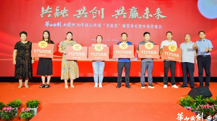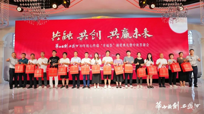 为感谢合作盟友一直以来的关注和支持,华山论剑西凤酒对在市场拓展、品牌建设等方面取得了显著成绩的“幸福荟”会员单位给予了表彰奖励,并举行了“状元之家奖”“宴会明星奖”“30年核心终端奖”的颁奖仪式。