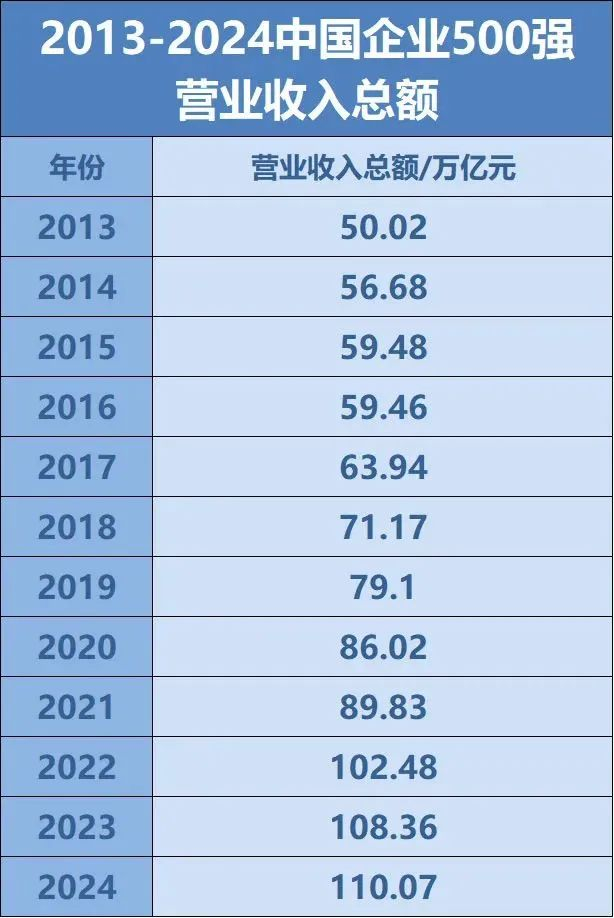 2024中国企业500强营业收入迈上新台阶,突破了110万亿元大关,达110.07万亿元,较上年相比增长1.58%。