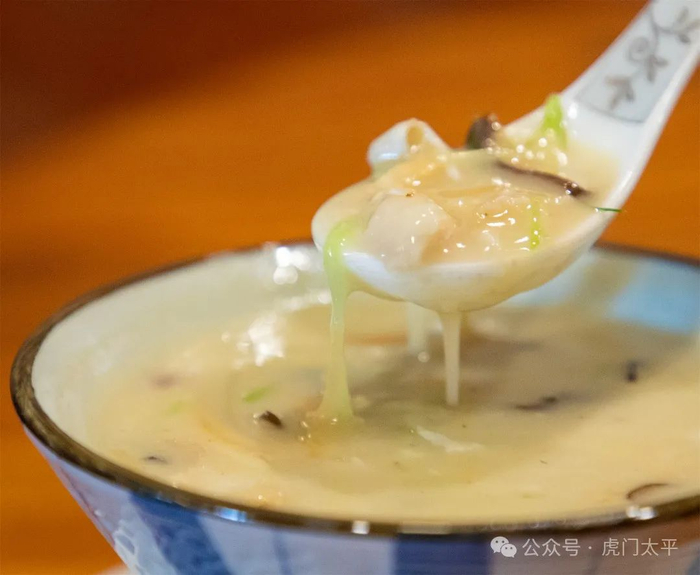 亭台楼阁、青砖石柱,𠮩𠹌馆是一家充满岭南风情的顺德私房菜。拆鱼云羹,鱼头、木耳、胜瓜等10种食材熬制而成,奶白的鱼汤,顺滑又爽脆。