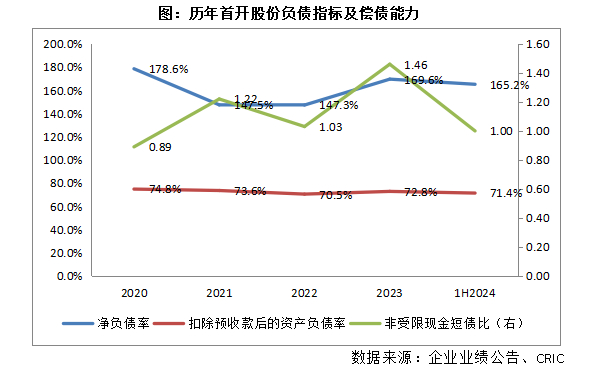 2024上半年,首开股份持有现金144亿元,较期初下降37%。总有息负债约1140亿元,较期初略有下降3%;其中,短期有息负债下降21%至120亿元。首开股份在年报中披露,公司剔除预收账款后的资产负债率和净负债率未达标,现金短债比持续达标。经计算,扣除受限制现金后的现金短债比为正好维持在1以上,净负债率约165%,扣预后资产负债率71.4%。未来要做好现金流管理及债务偿还工作。