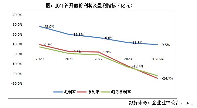 2024上半年,首开股份实现营业收入87.92亿元,同比下降55%;毛利润8.34亿元,同比下降62%。净利润亏损21.74亿元。从盈利指标来看,上半年毛利率为9.5%,相比2023年同期下降了两个百分点。