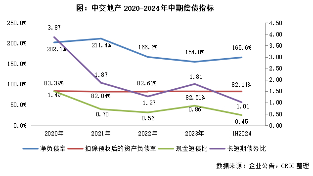 截至2024年中期,中交地产共持有现金80.53亿元,较期初减少32.9%;总有息负债约为362.03亿元,较期初减少8%。其中,短债总额179.9亿元,较期初增加28.5%,现金短债比较期初降低了0.41至0.45,若是剔除掉受限制现金之后非受限现金短债比更是仅有0.37,企业在短期内偿债压力相对较大。杠杆率水平方面,截至2024年中期,中交地产净负债率165.56%,剔除预收账款资产负债率82.11%,分别较期初提高10.8个百分点和降低0.4个百分点。