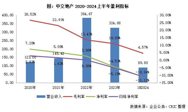 【年内营收止跌回升,净利润继续亏损】2024上半年中交地产实现营业收入89.8亿元,同比增长2.5%;2024年中期中交地产的合约负债为208.9亿元,较期初减少3.2%,企业正“严格按照时间节点安排,多方联动对低效、无效存货资产进行细致盘点”,细化去化方案。2024上半年中交地产整体毛利率约为4.57%,同比下降3.58个百分点,净利润亏损9.99亿元。净利润的亏损一方面是由于限价项目结转拉低了企业的盈利空间;另一方面,在市场下行下企业继续计提了2.26亿元的资产减值损失,此外还计提了168万的信用减值,同时企业的财务费用同比增加了131.7%至5.09亿元。
