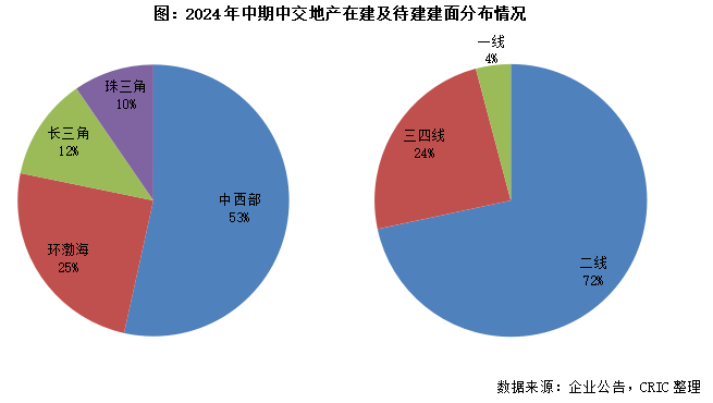 【上半年没有拿地,总土储超七成位于二线城市】2024上半年中交地产没有进行拿地,在行业整体下行且企业资金链较为紧张的情况下,企业大幅降低了拿地力度。截至2024年中期,中交地产共拥有117个项目,总计容建面约为2263.3万平方米,其中在建及待建面积997.23万平方米。在建及待建总土储72%位于二线城市,整体看来企业的土地储备质量相对较高。