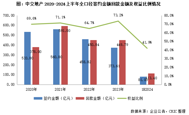 2024上半年中交地产实现销售金额81亿元,销售面积113.4万平方米,分别同比减少62.26%和56.73%,销售权益相较于2023年全年大幅降低31.3个百分点至41.9%。虽然中交地产在上半年的销售表现出现了较大的下滑,但是企业积极推动销售回款,增强现金安全性,在上半年实现销售回款92.7亿元,回款率达到了114%,继续保持着较高的水平。