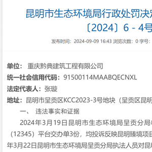 处罚决定书显示,呈贡区KCC2023-3号地块(呈贡区昆明臻境项目,推广名邦泰臻境)施工方重庆黔典建筑工程有限公司,在2024年3月19日夜间22:00至2024年3月20日凌晨3:00进行主体混凝土浇筑及土方清运作业,使用2台挖掘机进行夜间土石方开挖及清运施工作业,被投诉夜间施工噪声扰民。