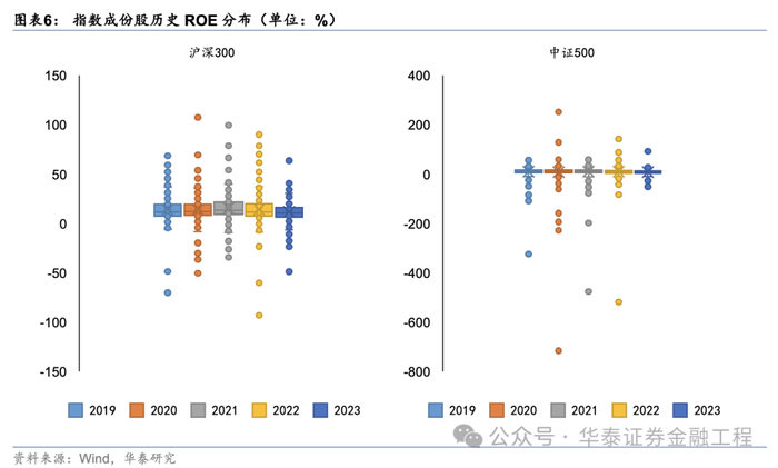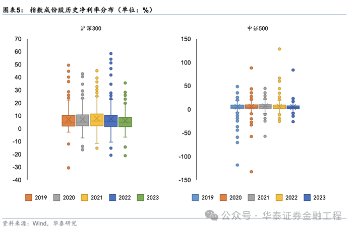 沪深300样本股的净利润率和股东权益报酬率(ROE)较为集中,显示出其持续的获利能力与稳固的财务状态。与其他A股代表性股票指数相比,沪深300的成份股盈利能力数据在横截面的分配上更为均衡,较少见到异常值的出现,这导致它在不同的市场阶段的时间序列变动上也相对较小。沪深300指数的编制方法也决定了市场进行周期性的调整后,指数也能挑选出那些具有卓越盈利能力和可靠性的公司作为代表。