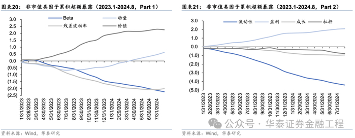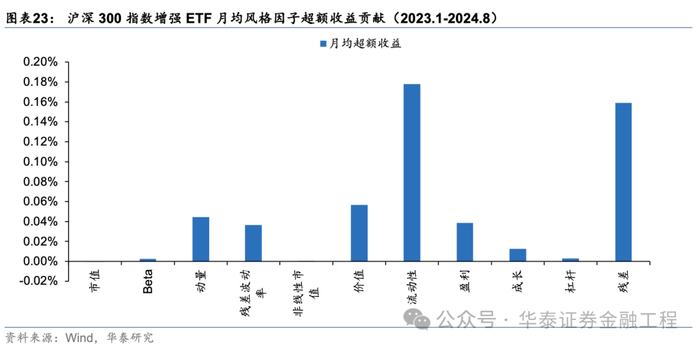 由于华安沪深300增强策略ETF有更为详尽的持仓数据,通过对其归因分析我们发现,其在市值与非线性市值因子上的超额暴露较小,波动性低,表明其对市值风格进行了严格限制,降低了风格风险。在其他因子上,基金低配Beta、残差波动率、流动性、成长等因子,当前高配价值、盈利、动量因子,倾向于高动量、低估值、高盈利和低波动的股票,同时Alpha选股表现理想,整体稳健。