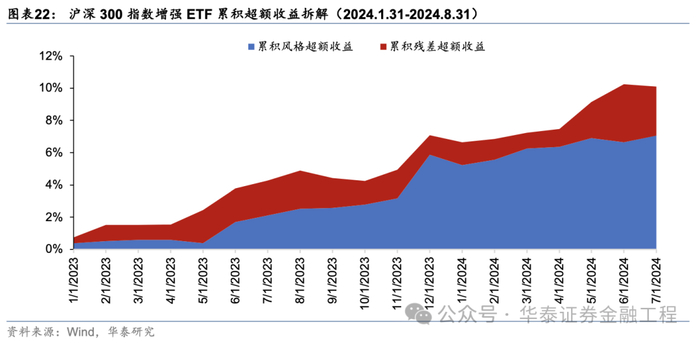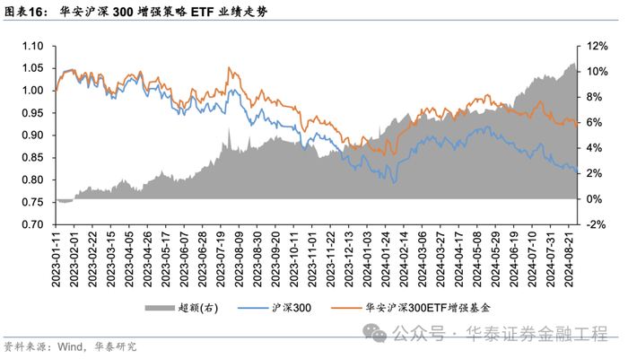 以华安沪深300增强策略ETF为例,其上市以来截至2024/8/31累计超额收益达到10.24%,超额最大回撤幅度仅为5.45%。年内累计收益为4.44%,超额收益达7.64%。华安沪深300增强策略ETF的相对表现较优,在较低的跟踪误差下实现了10.24%的累计超额回报。华安沪深300增强策略ETF的高收益风险比特征始终如一,展示出其对市场变化的强适应性和策略的稳健性。