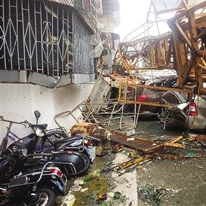 本报讯 日前,超强台风“摩羯”过境海口,海口阳光巴洛克广场建筑工地一塔吊倒塌,吊臂砸在第一砖厂北小区二栋居民楼楼顶,导致墙体破损开裂。此外,塔吊主架将小区里停放的十几辆小车砸坏,损失惨重。