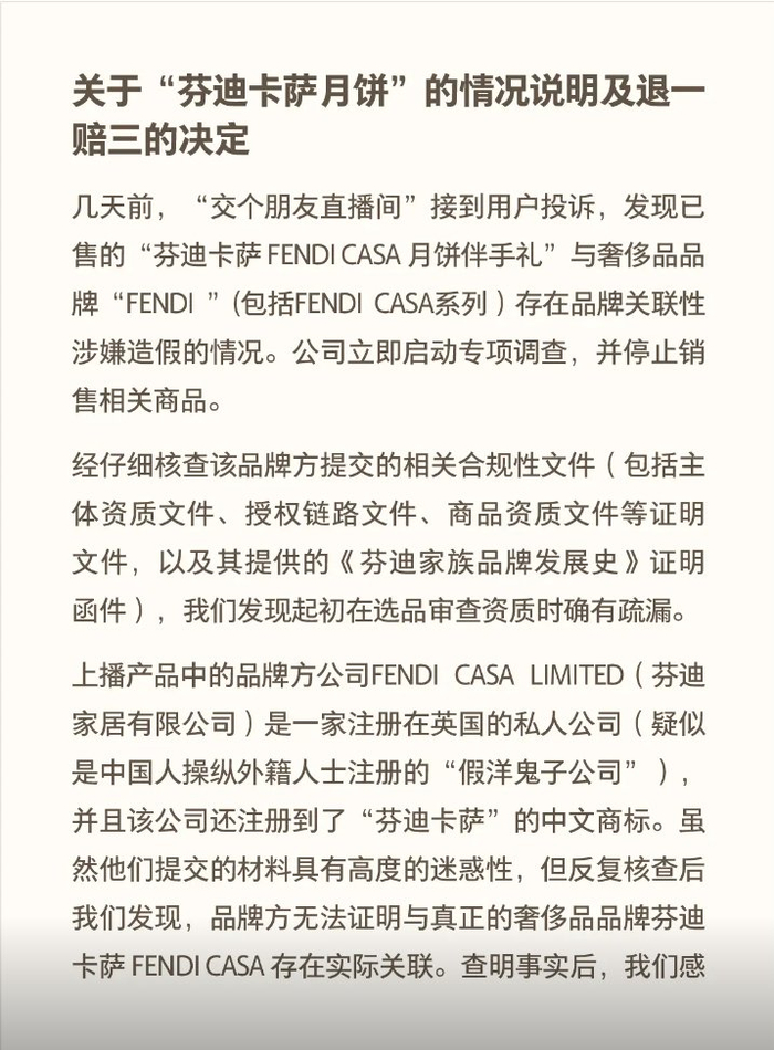 “交个朋友直播间”称,接到用户投诉,发现已售的“芬迪卡萨 FENDI CASA 月饼伴手礼”与奢侈品品牌“FENDI”(包括 FENDI CASA 系列)存在品牌关联性涉嫌造假的情况。公司立即启动专项调查,并停止销售相关商品。
