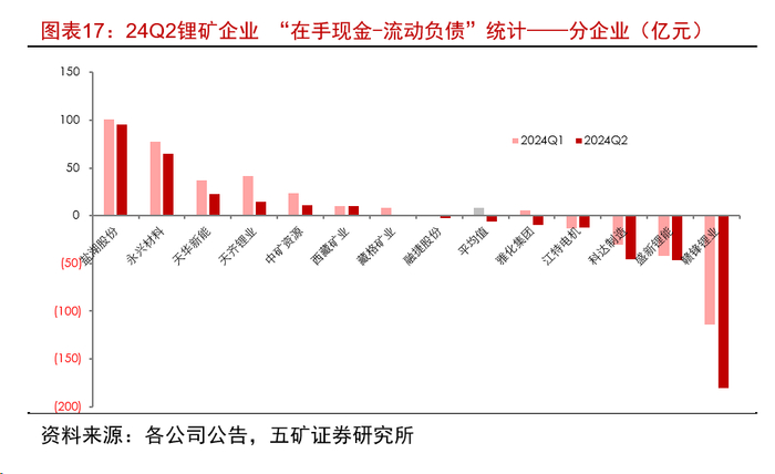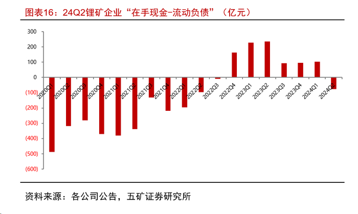 •6)在手现金:”在手现金-流动负债“两年来首次转负。”在手现金-流动负债“24Q2同比下降133%至-77.3亿元,我们将其作为衡量企业可灵活支配投资指标,对应中资锂矿企业可投资能力显著转弱。