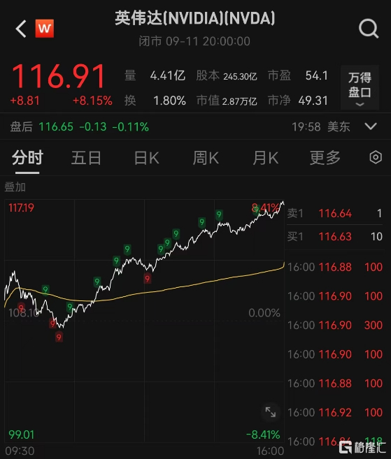 英伟达在美股早盘一度小幅转跌下逼107美元,随后伴随着黄仁勋的讲话涨幅不断扩大,到尾盘时仍在不断刷新日高,最高涨8.4%一度升破117美元。