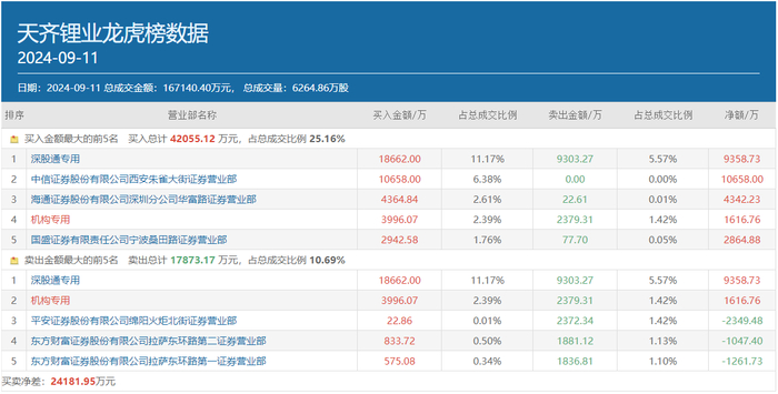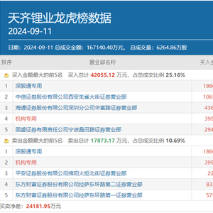 值得一提的是,除了方新侠以外,9月11日北上资金也在积极买入天齐锂业,深股通专用席位同时出现在该股买卖双方榜首,净买入金额为9358.73万元;有一个机构专用席位也同时出现在天齐锂业龙虎榜买卖双方前五位中,净买入金额为1616.76万元;另有知名游资宁波桑田路的常用席位国盛证券宁波桑田路也买入该股2942.58万元。