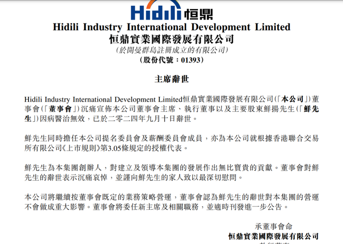 据恒鼎实业最新公告,恒鼎实业董事会沉痛宣布公司董事会主席、执行董事以及主要股东鲜扬因病医治无效,已于2024年9月10日辞世。