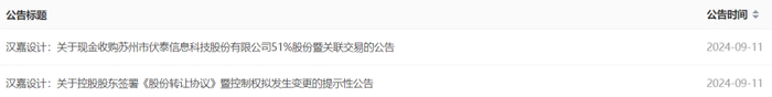 9月11日,汉嘉设计(300746)发布关于现金收购苏州市伏泰信息科技股份有限公司51%股份的公告、关于控股股东签署《股份转让协议》暨控制权拟发生变更的提示性公告。