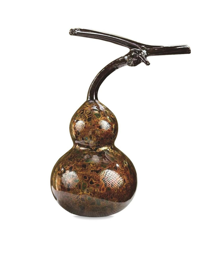 之后,开始上底漆、做堆起,也叫打埝,比如用干枯的丝瓜瓤蘸着生漆,星星点点地涂抹在平滑的葫芦表面,不能全部涂抹,只要保证生漆凝固之后,表面高低凹凸不平就可以,像皮肤上突起的鸡皮疙瘩一样,因为每个人涂抹生漆的手法、力度都不同,这也直接决定了后期呈现出来的花纹和纹路的随机性。