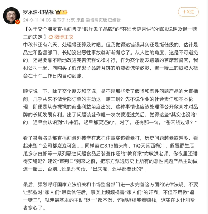当天下午,罗永浩在其个人微博发文就售卖“假洋品牌”的“芬迪卡萨月饼”的情况作出说明,并诚挚道歉,表示“将会退一赔三”。