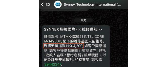 由于没有酷睿i9-14900K库存可供换货,代理商为用户安排全额退换