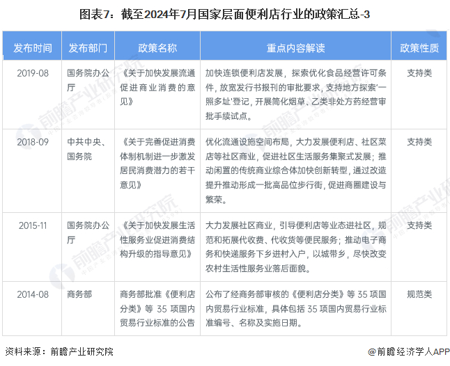 2015年,国务院指导意见强调发展社区商业,推动便利店业态深入社区;2020年,多部门联合提出进一步促进社区生活服务业发展,加快便民商圈建设;"十四五"规划期间,政策着力于便利店设施改造升级,推动无接触交易服务,并强调商贸流通的标准化和绿色发展;2023年,商务部等部门推出行动计划,创新服务模式,致力于提升居民生活便利性。整体上,中国便利店行业政策发展趋势指向便民服务的深化、技术创新和可持续发展,以构建高效、环保的便利店服务体系。以下是近十年来与便利店行业相关的政策汇总: