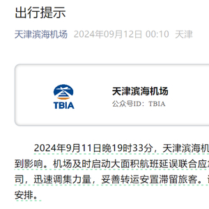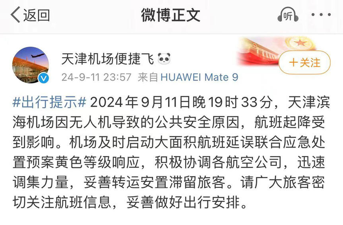 “天津滨海机场”官方公众号、“天津机场便捷飞”微博发布出行提示,2024年9月11日晚19时33分,天津滨海机场因无人机导致的公共安全原因,航班起降受到影响。机场及时启动大面积航班延误联合应急处置预案黄色等级响应。