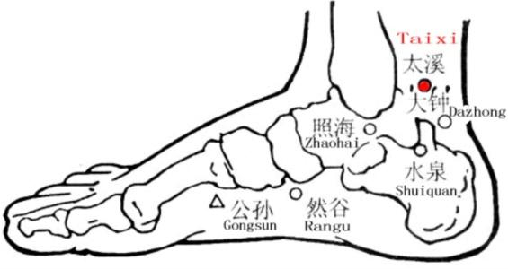 太溪穴:属足少阴肾经,在足内侧,内踝后方,当内踝尖与跟腱之间的凹陷处。太溪穴滋阴清热、益肾安神,可治疗热病烦心、失眠和咽喉不利。快速取穴:坐位垂足,由足内踝向后推至与跟腱之间凹陷处即是太溪穴。