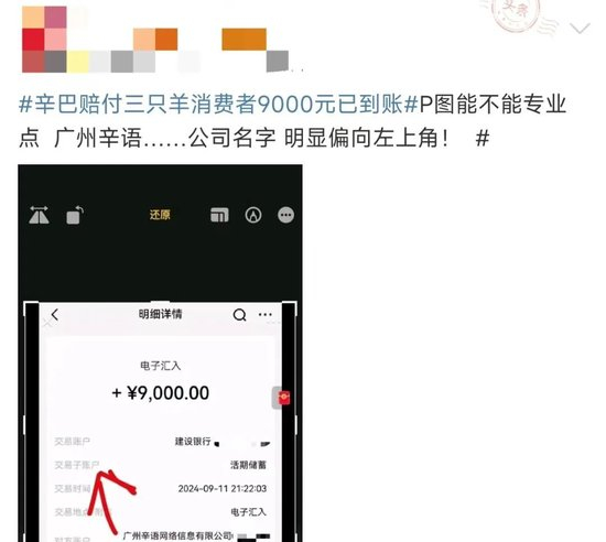 大河报记者注意到,11日晚间,已有IP为山东、广东、河南等地的不少网友在辛巴账号视频留言区晒出截图,称已经收到相关款项,交易时间为当晚9点多,交易金额9000元,付款方为广州辛语网络信息有限公司,天眼查app显示,该公司是辛选集团成员。