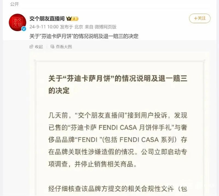 就在9月11日,交个朋友直播间称,发现此前销售的“芬迪卡萨FENDI CASA月饼伴手礼”与真正的奢侈品品牌“FENDI”并无实际关联,涉嫌品牌造假。该公司停止相关商品的销售,并对所有购买用户先行赔付,退一赔三。