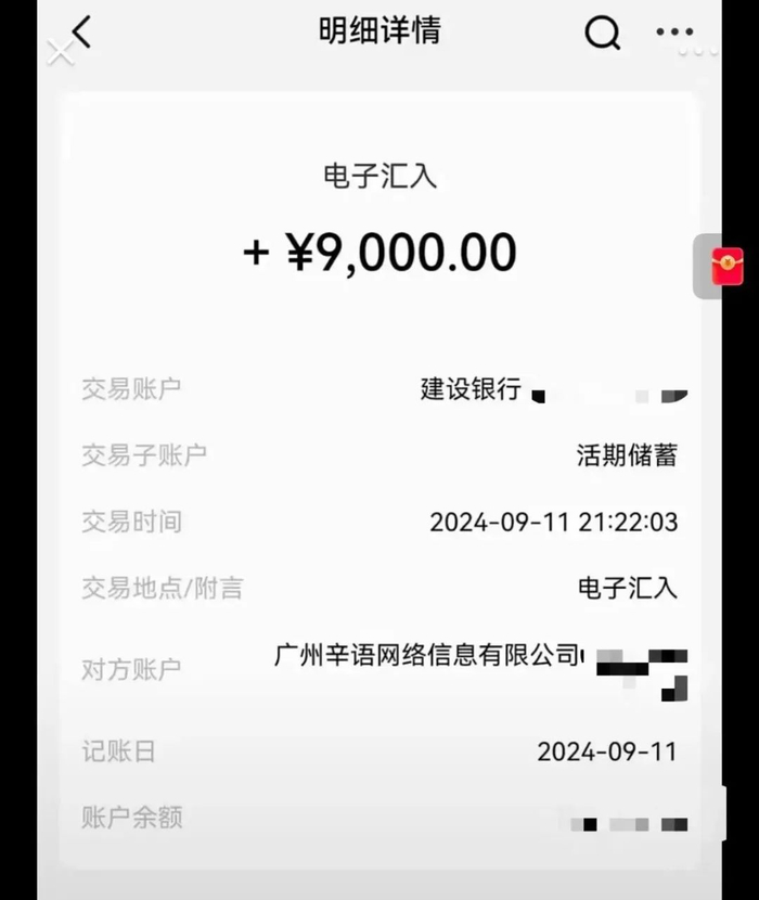 11日晚,IP为山东、广东、河南等地的不少网友在辛巴账号视频留言区晒出截图,称已经收到相关款项。交易时间为当晚9点多,交易金额9000元,付款方为广州辛语网络信息有限公司,天眼查app显示,该公司是辛选集团成员。