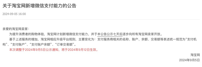9月5日,淘宝、天猫分别发布《关于淘宝网新增微信支付能力的公告》《关于天猫新增微信支付能力的公告》称,为提升消费者的购物体验,计划新增微信支付能力,并于该公告公示七天后逐步向所有卖家(商家)开放。本次调整于2024年9月5日公示通知,于2024年9月12日生效。