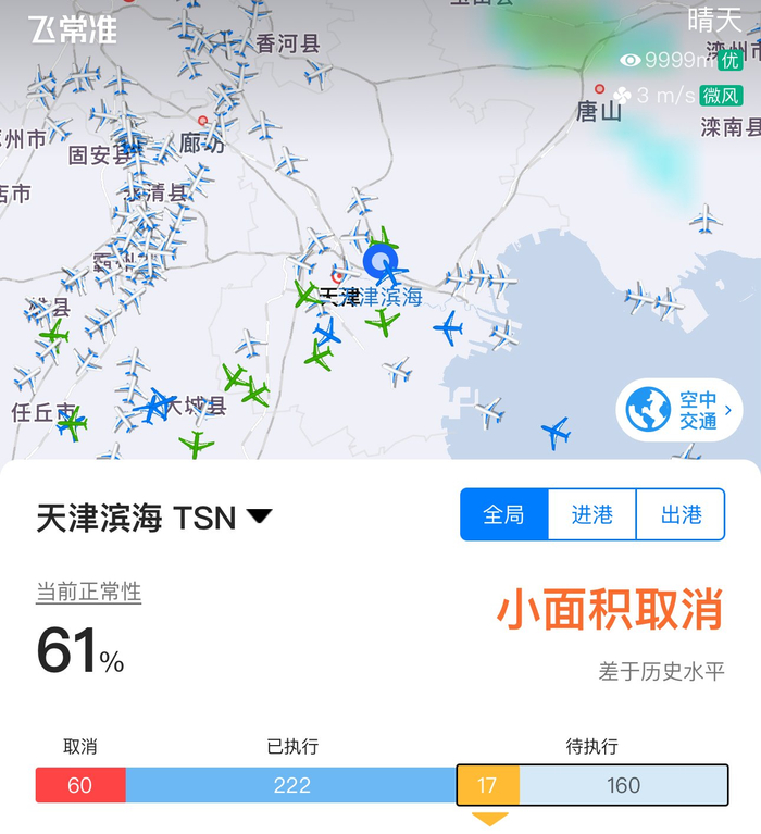 界面新闻在飞常准APP查询到,今日天津滨海机场航班小面积取消,已执行222架、待执行177架、取消60架。