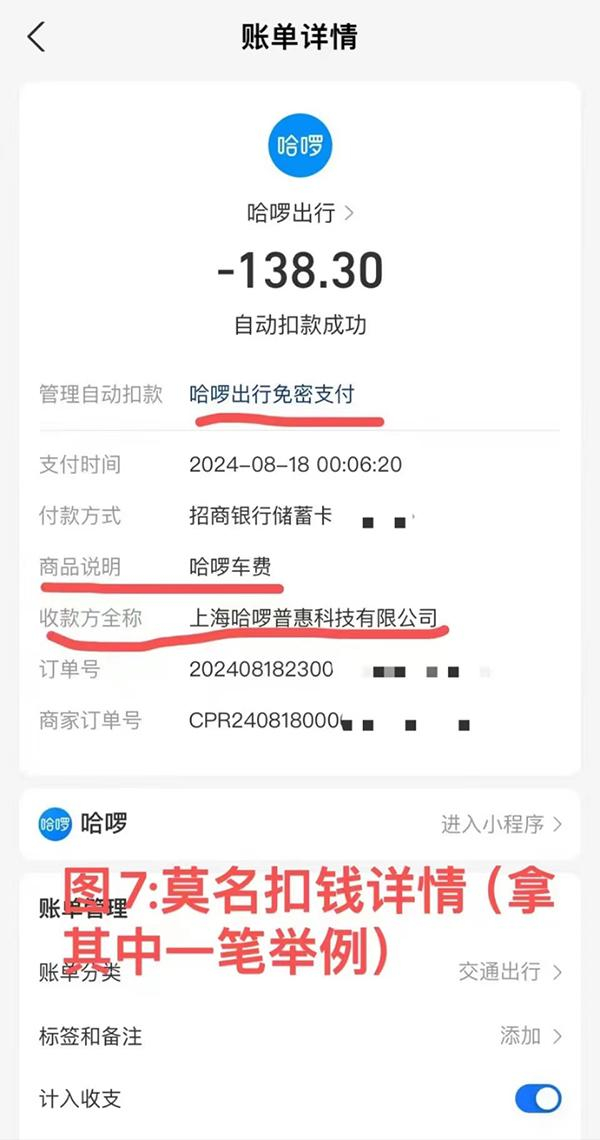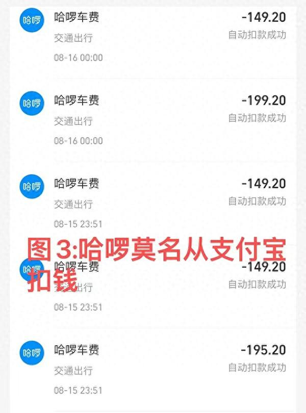 他发给澎湃新闻记者的扣款截图显示,8月15日23:51,扣款195.2元,扣款项目为“交通出行”“哈啰车费”,系统显示“自动扣款成功”。8月18日的一个“账单详情”显示,自动扣款方式为“哈啰出行免密支付”,收款方为“上海哈啰普惠科技有限公司”。