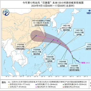 9月12日17时到15日20时,多云有雷阵雨,偏东风5级,雷雨时阵风7-8级。