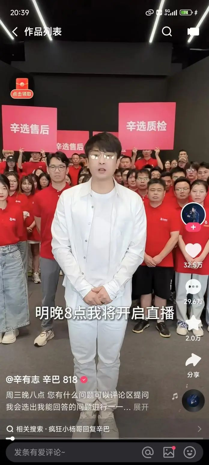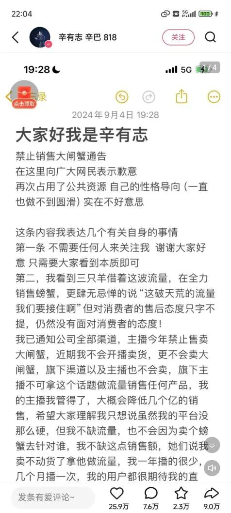 9月4日晚,辛有志表示,已经通知公司全部渠道,主播今年禁止售卖大闸蟹。他还在直播间向小杨哥下“最后通牒”,“请你在一周之内对吹风机、茅台、梅菜扣肉正式发公函,有个面对消费者的态度,把你的300个售后客服放在消费者身上”。