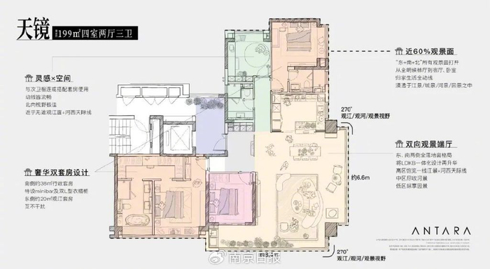 定制199㎡户型,以8.4*6.6m的双落地窗格局+270°的观江视野,实现罕见的“东+南+北”三面观江。登览高区,领略李白诗中“唯见长江天际流”的震撼感。
