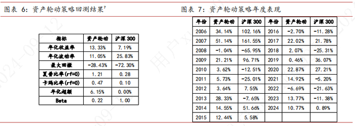 其中表示单日涨跌幅,表示回测区间交易日总数,资产轮动策略的年化超额为组合收益与沪深300的年化收益率之差,动态久期策略的年化超额为组合收益与5年期国债的年化收益率之差。Beta为资产轮动策略对沪深300就其日涨跌幅做一元线性回归得到的回归系数。