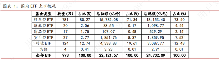 随着资本市场加速发展,ETF逐渐成为投资者重点关注的热门投资工具。截止至2024年6月30日,国内已发行上市的ETF共973只,总基金规模达到24732.09亿元,包括股票型ETF、债券型ETF、商品性ETF、货币型ETF和跨境型ETF等。其中,股票型ETF占比最大,基金规模占比超过70%。