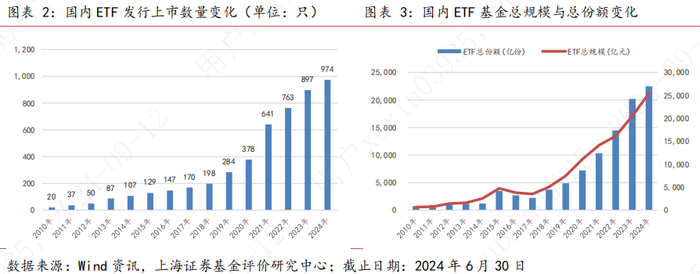 从国内ETF的历史发展趋势来看,截止至2024年6月30日,国内ETF的产品数量从2010年仅有的20只开始每年均有所提升,并在2019年开始出现爆发式增长。基金份额与基金规模同样呈现不断正增长的趋势,仅在2016年经历股灾时出现回落,直到现今的2024年依旧处于持续的高速增长趋势中。值得注意的是与2016年初的股灾给市场带来的冲击不同,2021年的新冠疫情以及后续国内经济下行的环境并未给市场投资者对ETF产品的投资热情产生明显的负面影响。ETF作为指数投资强有力的工具可以有效帮助投资者实现基于“精准投资”的长期资产配置,而其拥有的实时交易特征也为投资者提供了实现短周期交易策略的低成本工具。