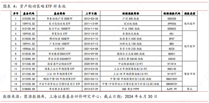 基于以上想法,我们在构建适用于资产轮动策略的ETF样本池时将尽可能覆盖多个大类资产与不同国家市场,其中包括中国股市、债券市场、香港股市、美国股市、欧洲股市、黄金等。具体ETF列表如下: