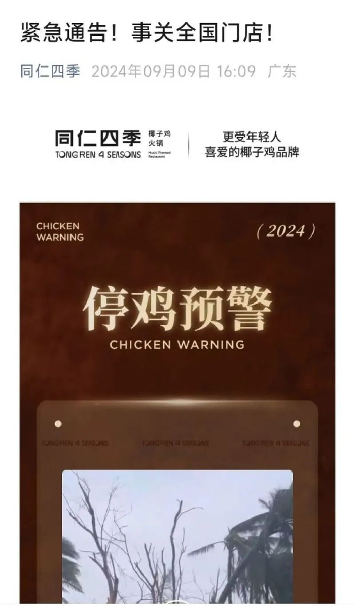 此次台风对文昌鸡养殖链条的影响直接传导到餐饮消费环节。9月8日,连锁椰子鸡火锅品牌“四季椰林”发文称,受到台风“摩羯”影响,其位于海南文昌的文昌鸡养殖基地损毁严重,未来6个月内门店将限量供应文昌鸡,直到新一批文昌鸡养殖达到供应标准。