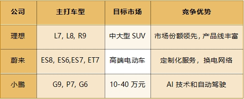 理想汽车在智能驾驶方面具有优势,蔚来汽车和小鹏汽车则在智能座舱和新能源汽车技术方面更具优势,三家公司都在持续进行技术研发和创新,以保持技术领先地位。