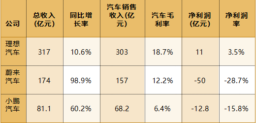 理想汽车收入规模最大,但净利润率相对较低;蔚来收入增长最快,但净利润为负;小鹏汽车收入增长迅速,但净利润率也较低。