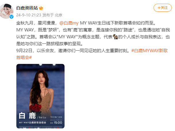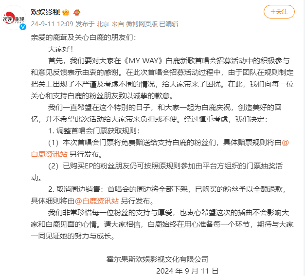 日前,演员白鹿上线首张数字音乐专辑,获得了粉丝的高度关注。9月10日,白鹿新歌首唱会官宣,白鹿将在9月22日生日当天,于上海船厂剧院携自己首张音乐专辑与粉丝们见面,并公开了演唱会门票的获取方式,演唱会的相关规则引发粉丝不满,被不少网友吐槽“首唱会变成韭菜会”。9月11日,演唱会的主办方欢娱影视致歉宣布调整门票获取规则。