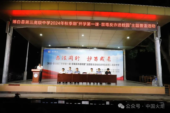9月9日,博白县关工委联合县司法局、县教育局、县公安局走进博白县第三高级中学开展新学期“开学第一课·禁毒反诈进校园”主题普法宣传活动,为三中全校师生送去一节生动的法治“公开课”,用心用情用力护航青少年健康成长。