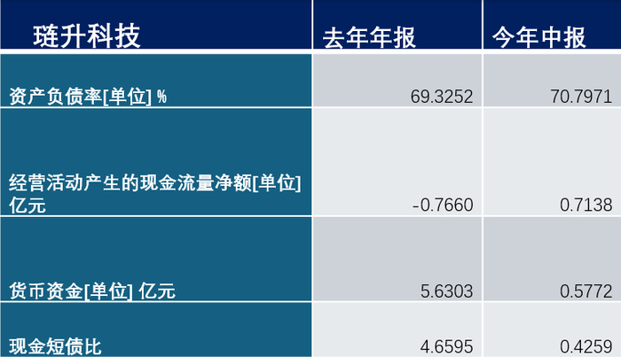 (2)去年年末琏升科技的货币资金为5.63亿元,今年中报只有5772万元。现金短债比由去年年末的4.66,骤降至今年2季度末的0.43。