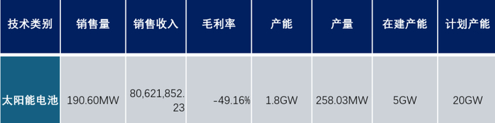 (3)琏升科技去年下半年已经建成的电池产能有3.8GW,上半年理论产能为1.9GW。若是以表格中的1.8GW计算,上半年实际产量为258.03MW,那么琏升科技的开工率只有14.34%。