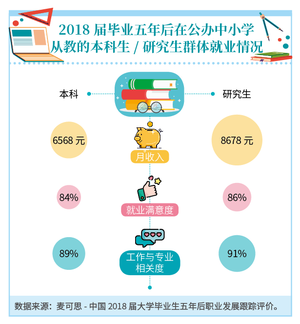 学历提升也让从教群体有了更高的就业质量。麦可思研究发现,2018届毕业五年后在公办中小学从教毕业生中,拥有研究生学历群体月收入为8678元,比本科生群体(6568元)高出2110元。研究生学历群体的就业满意度(86%)和工作与专业相关度(91%)也要优于本科生从教群体。