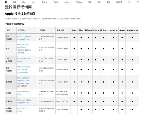 从名单来看,苹果官方认可的平台自营或自有网站包括百联、京东、山姆、顺电、苏宁易购、天际购、五星享购、中国移动