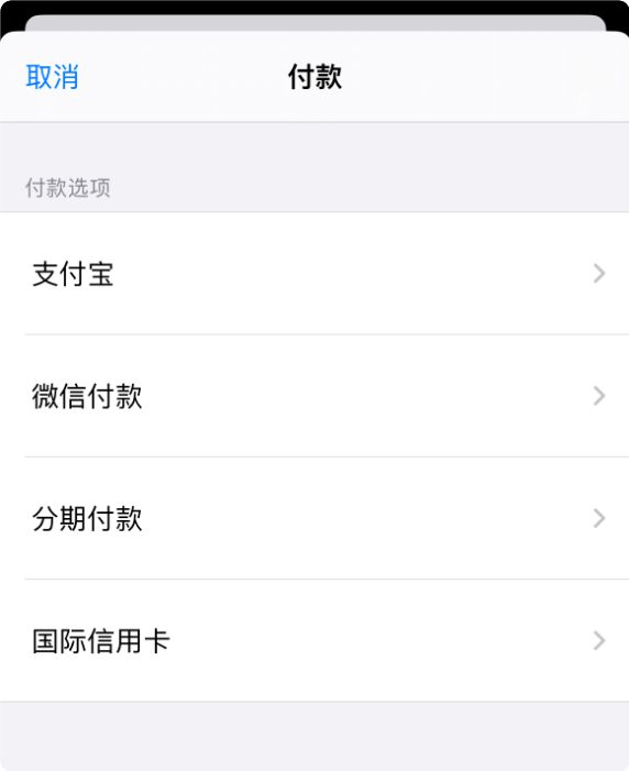 付款方式可选支付宝、微信付款、分期付款和国际信用卡,如果选择信用卡支付,也需要提前在设置中完成卡号等信息填写。